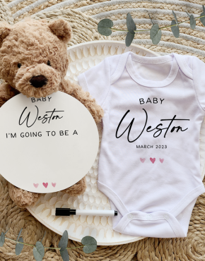 Our Personalised Baby Announcement Onesie & Plaque Sets are here to make your big news adorable, stylish, and totally Instagram-worthy. These onesies are printed with your family surname and the due date of your new Mini Peep (because “Guess what?!” just doesn’t cut it anymore).