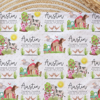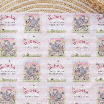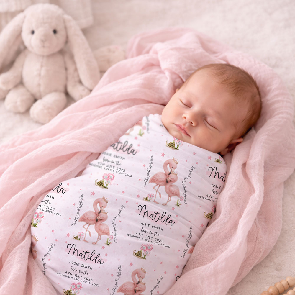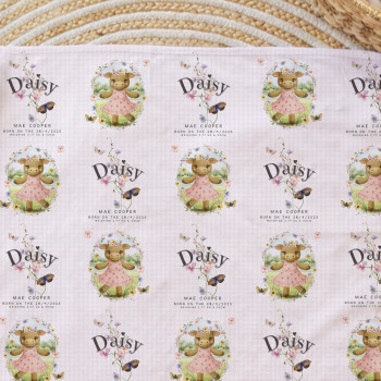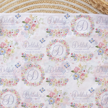 Printed on one side with a repeating pattern so your Mini Peep’s name stays visible even when wrapped burrito-style (a parenting classic). White reverse side for extra softness against delicate newborn skin.