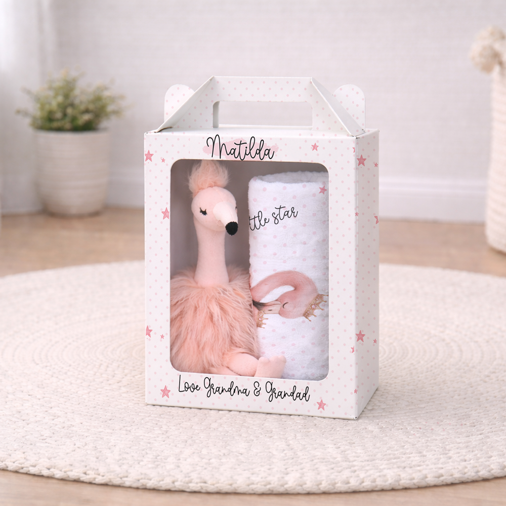 Our Snuggle Buddy Gift Set bundles together a super-soft plush O.B Designs toy and a personalised reversible blanket, all wrapped up inside a matching personalised gift box. No wrapping required. Maximum gift points unlocked.