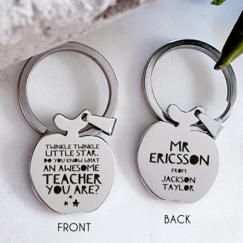 Your chosen Design is featured on the front of the key ring and your Child’s Name and Teachers Name on the back.