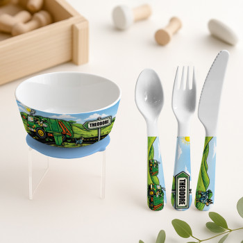 • A spoon, fork, and knife designed for tiny hands learning the fine art of food flinging.