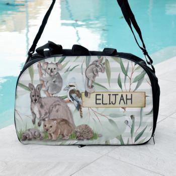 DEETS: 45cm x 30cm x 21cm deep. Two carry handles and an adjustable shoulder strap. Dedicated water resistant shoe compartment. Velcro side pocket. Zippered back pocket. Large internal area. Illustrated & Printed in Brisbane, Australia